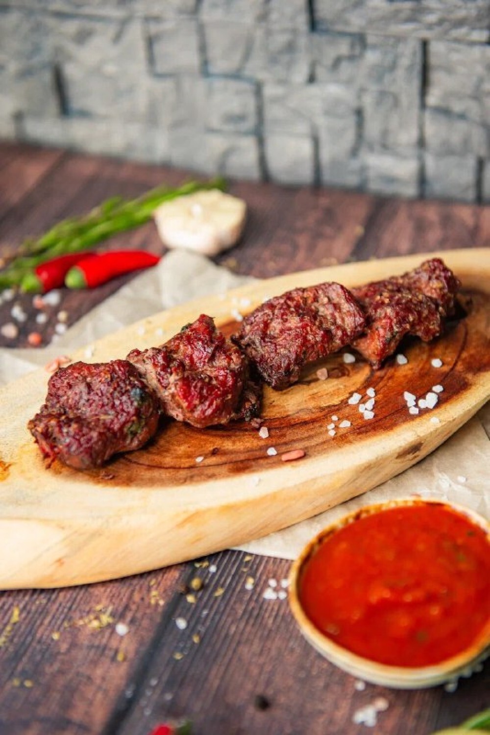 Сочный шашлык из отборной говядины, искусно приготовленный на углях, подается с маринованным луком и пикантным соусом нашего приготовления. Насладитесь насыщенным вкусом и ароматом!