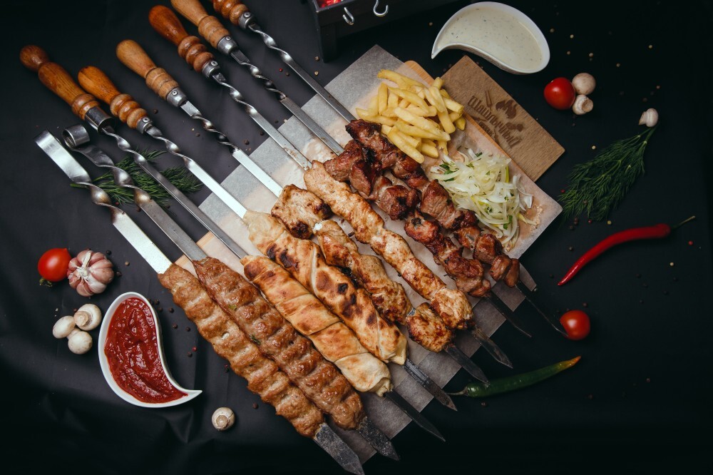 Шея 2 Куриный шашлык 2 Люля из говядины 1 Люля куриный 1 Хачапури 2 Картофель фри 3 + Фирменный Чесночный соус в подарок. К сету подается маринованный лук и фирменный соус.