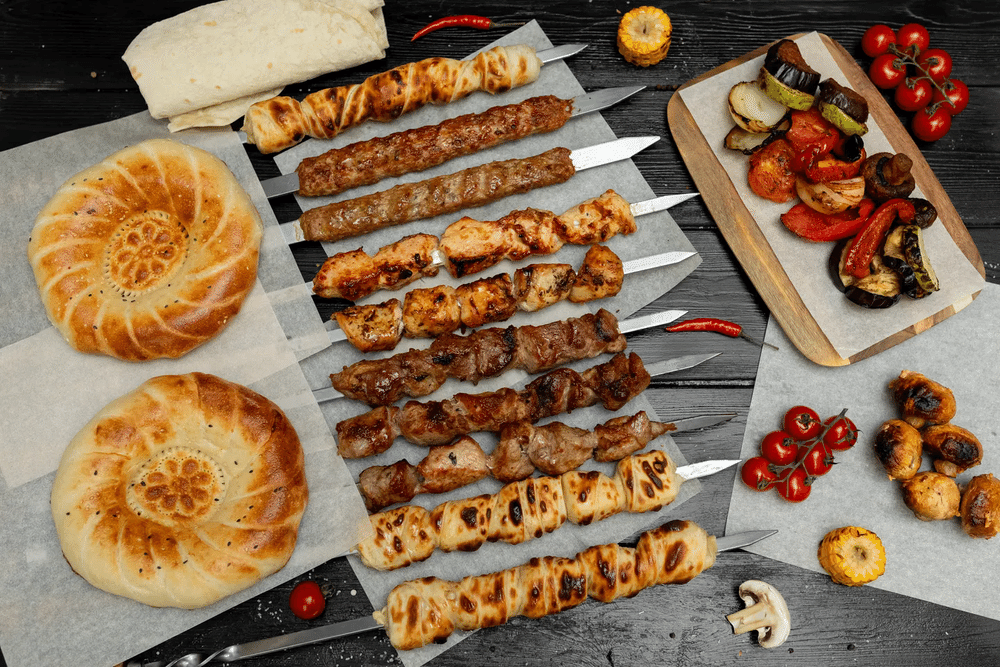 Шея 3 Куриный шашлык 2 Люля говядина 2 Овощи на гриле 2 Грибы 1 Хачапури 3 Лаваш 2 Лепешка 2 К сету подается маринованный лук и фирменный соус.