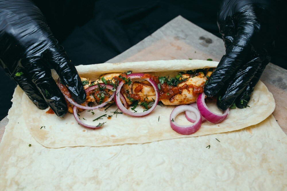 Подаётся в лаваше с маринованным луком и соусом барбекю